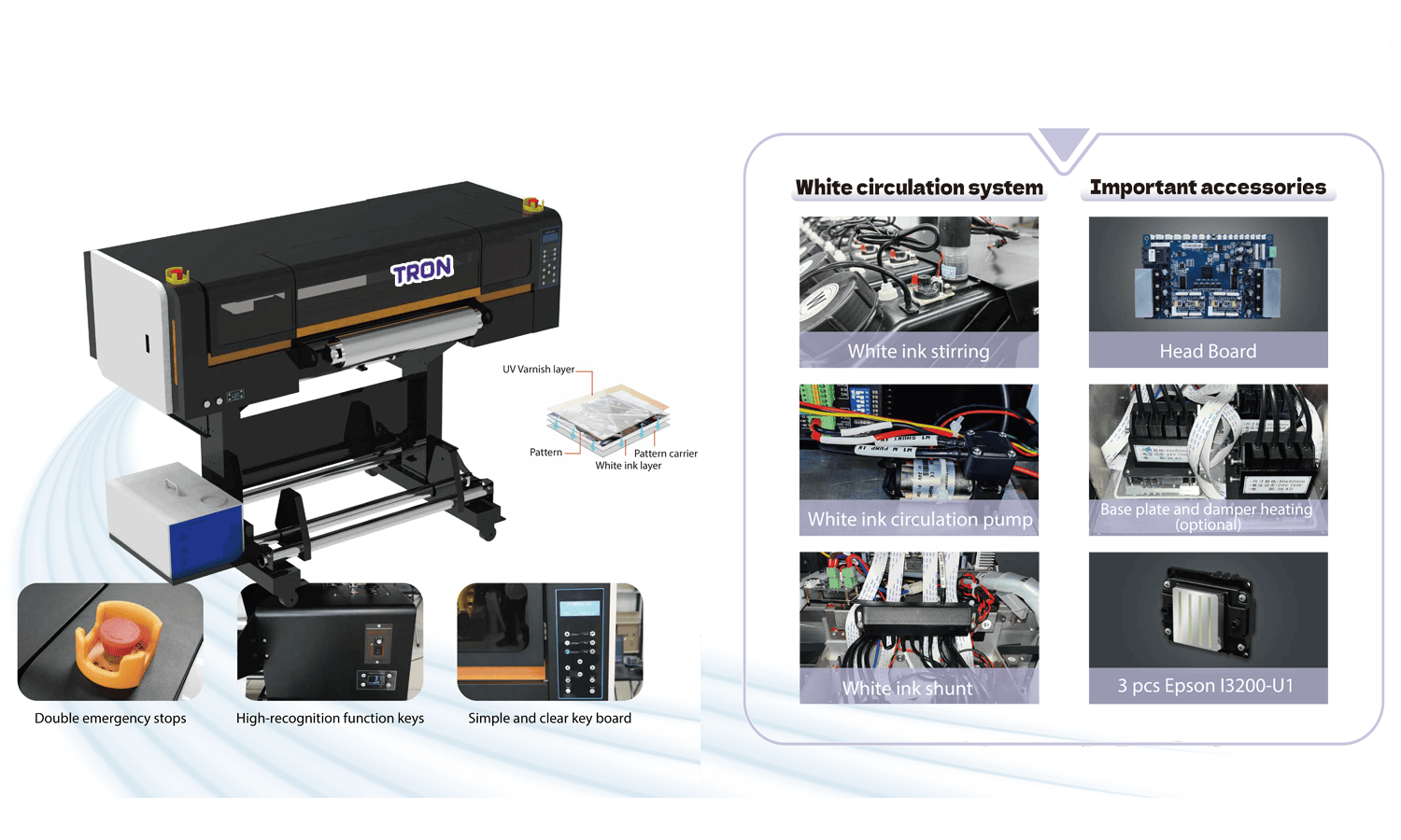 The Tron UV DTF 24 PRO is a professional 24-inch UV DTF printer equipped with three Epson I3200-U1 printheads for high-precision, multi-layer printing. Designed for consistent production, it supports CMYK, white, and varnish output with excellent detail, smooth gradients, and durable UV results, making it ideal for labels, decals, and specialty graphics.